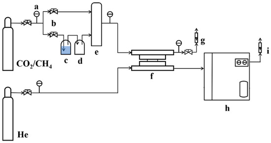 Schematic diagram of the laboratory-made gas permeance analysis platform. The letters in Figure 1 represent: (a) high-precision pressure gauge; (b) high-precision needle valve; (c) humidification tank; (d) dehumidification tank; (e) buffer tank; (f) membrane cell; (g) mass flowmeter; (h) gas chromatography; (i) soap film gas meter.