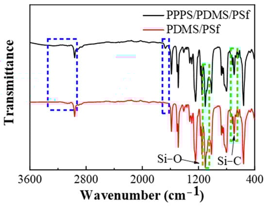 The infrared spectrum of PDMS/PSf and PPPS/PDMS/PSf composite membranes were implemented to characterize the functional groups of both membranes. As presented in Figure 2, the absorption peaks at 690 cm−1 and 1100 cm−1 are the characteristic bands of Si-C and Si-O respectively, indicating the successful coating of PDMS on PSf substrate. However, due to the thin PPPS separation layer, the infrared spectrum of the PPPS/PDMS/PSf composite membrane contains all the absorption bands of PDMS. The absorption bands around 3300 cm−1–3000 cm−1 and 1670 cm−1 confirm the presence of –OH and –NH2, which proves the PPPS/PDMS/PSf composite membranes were successfully prepared.
