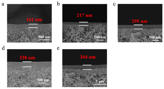 Figure 3 shows the cross-section topographies of the PPPS/PDMS/PSf composite membranes prepared based on the gutter layers with the PDMS concentration of 0.5–2.5 wt%. The continuous interfaces are clearly presented between the gutter layers and PSf substrate, indicating that the wet-dry combined coating method can effectively inhibit the pore penetration of PDMS in the polysulfone. The thickness of the composite membranes prepared by different PDMS concentrations were investigated further. As shown in Figure 3, with the increase of PDMS concentration, the thickness of PPPS/PDMS/PSf composite membranes increased from 161 nm to 364 nm.