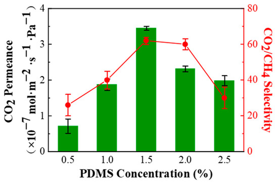 PDMS is the most widely used gutter layer material, the thickness of which is directly related to the gas permeability of the composite membrane [23,24]. The concentration of PDMS solution determines the thickness of the gutter layer. Therefore, in this section, the adjustment of the gutter layer thickness was achieved by fixing the wet coating thickness (300 μm) and changing the concentration of the cross-linked PDMS solution. To select the optimal PDMS concentration, the CO2/CH4 mixed gas (45/55 vol%) separation performance was examined at 298 K, saturated humidity and 0.15 MPa feed gas pressure after coating 0.15 wt% PPPS solution with a wet coating thickness of 150 μm on the prepared PDMS/PSf composite membranes.