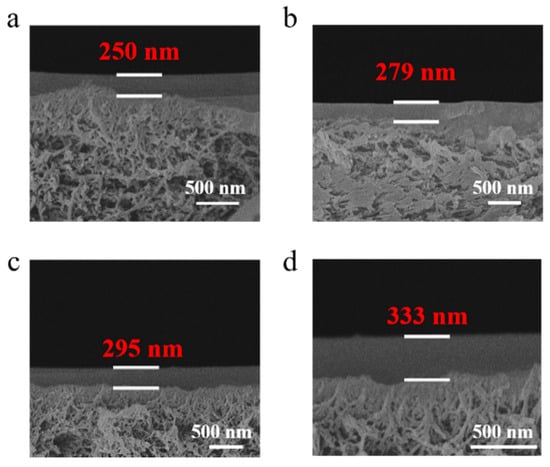 The cross-section topographies of the PPPS/PDMS/PSf composite membranes with the PPPS concentration between 0.05 wt% and 0.20 wt% were investigated by SEM. As shown in Figure 5, the thickness of the PPPS/PDMS/PSf composite membranes increases from 250 nm to 333 nm with the increasing PPPS concentration, which indicates that the separation layer is complete and thin.