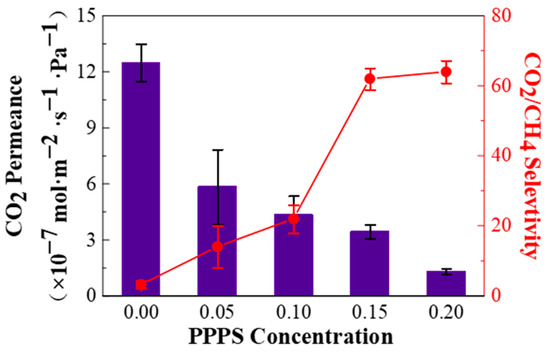 Effect of different PPPS concentrations on the CO2/CH4 (45/55 vol%) mixed gas separation performance of PPPS/PDMS/PSf composite membrane. Test conditions: 298 K, saturated humidity, and 0.15 MPa.