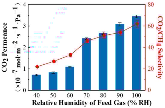 As shown in Figure 7, with the increasing relative humidity of the feed gas, the CO2 permeance and CO2/CH4 selectivity of the PPPS/PDMS/PSf composite membrane also increase. This is due to the following two aspects. Firstly, PVAm with abundant primary amine groups, which is the dominance in the separation layer, can react specifically and reversibly with CO2 and promote the transfer of CO2 across the membrane. The mechanism of primary amine groups promoting CO2 transfer can be expressed as the following formula [26]: