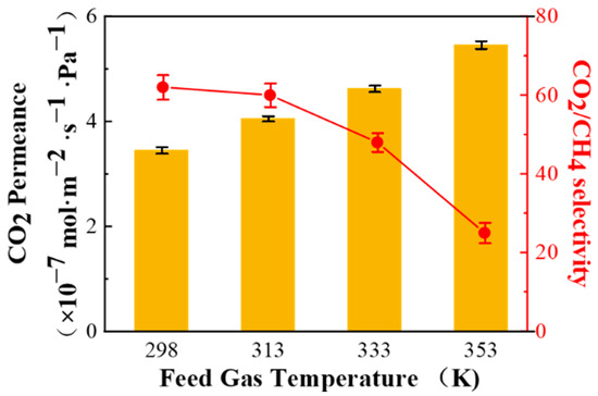 Firstly, the saturated vapor pressure increased with the feed gas temperature, which causes the increase of moisture content in the feed gas. As mentioned in Section 3.2.1, the increase of the water content in the feed gas strengthens the swelling degree and free volume of the composite membrane, resulting in an increase in the gas permeance. In addition, the increase of water content in the composite membrane also enhances the CO2 facilitated transport. Secondly, as the feed gas temperature increases, due to the exothermically reversible reaction between CO2 and primary amine groups, the reaction rate increases but the forward reaction equilibrium constant decreases, which is not conducive to the CO2 facilitated transport. Thirdly, the solution and diffusion process of CH4 adheres to Arrhenius’ law [27,28], thus the CH4 permeance increases significantly with the increasing feed gas temperature.