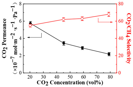 where, Qi is defined as the flow rate of gas composition (CO2 or CH4) penetrating through the membrane at the steady-state, the unit of which used in this paper is mol·s−1·Pa−1; ∆pi stands for the partial pressure difference of the gas composition between the retentate and the permeate side of the membrane; A is the effective separation area of the membrane. Under ideal circumstances, the CO2/CH4 selectivity of the membrane is approximately equal to: