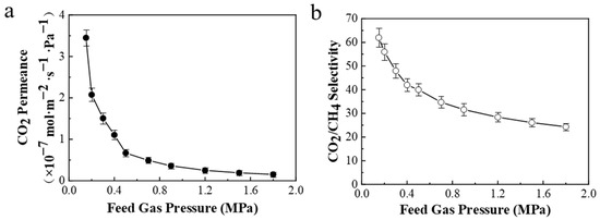 To further examine the effect of feed gas pressure on CO2/CH4 (45/55 vol%) separation performance, the PPPS/PDMS/PSf composite membrane was tested at a feed pressure of 0.15~1.8 MPa. As shown in Figure 10, the CO2 permeance and CO2/CH4 selectivity decrease rapidly with increasing feed gas pressure, which is mainly due to the following reasons. First of all, PVAm is a typical material mainly utilized in facilitated transport membrane, thus the PPPS/PDMS/PSf composite membrane displays the representative characteristics of facilitated transport, that is, CO2 permeance decreases with increasing CO2 partial pressure [29,31]. In addition, CH4 penetrates through the composite membrane by solution-diffusion mechanism, causing the CH4 permeance to be almost unchanged. Therefore, the CO2/CH4 selectivity decreases as the feed gas pressure increases.