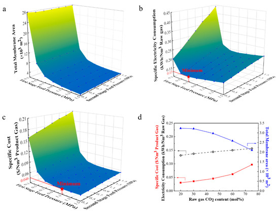 As presented in Figure 12c, when the raw gas was fixed as 45 vol% CO2 and 55 vol% CH4, the minimum specific cost can be reduced to 0.046 $·Nm−3 CH4 with the 1st- and 2nd-stage pressures of 1.1 MPa and 0.3 MPa, respectively. Compared with the 2nd-stage feed pressure, the 1st-stage feed pressure exerts a greater influence on the specific cost, for the 1st-stage feed pressure affects the total membrane area more obviously.