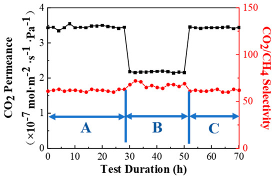 The PPPS/PDMS/PSf composite was continuously tested at 298 K, saturated humidity, and 0.15 MPa of the feed gas pressure for 70 h to verify the short-to-mid-term CO2/CH4 separation performance. As shown in Figure 13, the short-to-mid-term stability test was divided into three stages. The feed gas in the first 30 h consisted of 45 vol% CO2 and 55 vol% CH4 (stage A). At the 30th hour, the feed gas was replaced with the mixed gas containing 79 vol% CO2 and 21 vol% CH4 (stage B). Then at the 50th hour, it was restored to the mixed gas same with stage A (stage C). In the three stages of A, B, and C, the PPPS/PDMS/PSf composite membrane maintained stable CO2/CH4 separation performance, indicating that the composite membrane exhibited excellent short-to-mid-term stability.