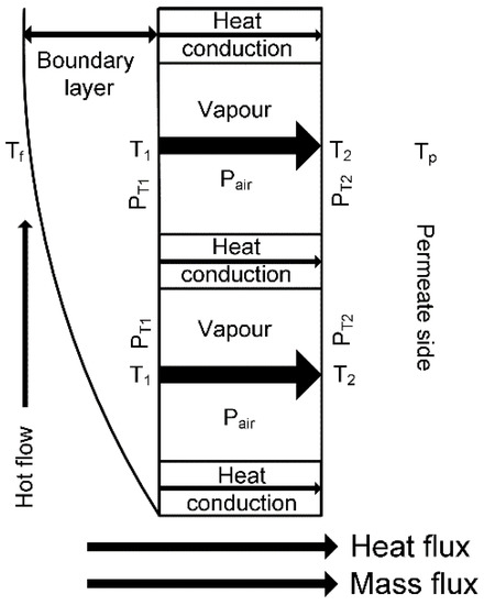 - secondly, transportation of vapour from the interface between the feed and the membrane to the interface between the membrane and permeate side, which is driven by the vapour pressure difference across the membrane pores; and