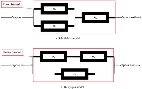 An electrical circuit analogue can be used to describe the transport mechanism of the gas molecule through the porous membrane [6,52], as shown in Figure 2, in which Schofield’s model [36] as shown in Figure 2a and the dusty-gas model, as shown in Figure 2b [53,54], are the other two most popular models used in MD.