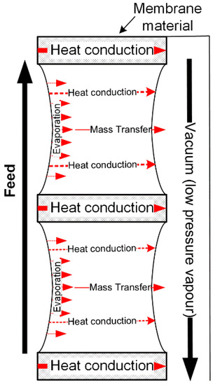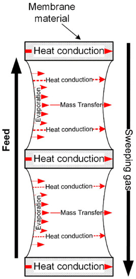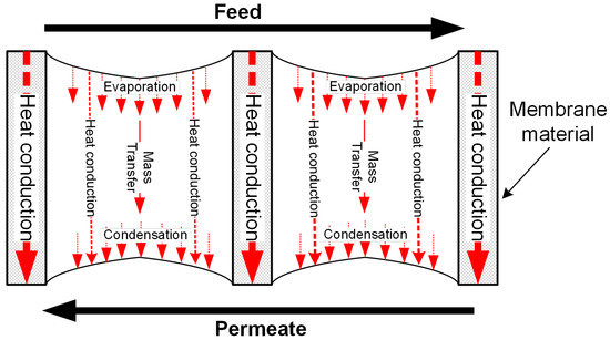 Since the MD is associated with evaporation, both thermal energy and mass are transferred simultaneously from the feed side to the permeate side as shown in Figure 1. In Equation (1), the latent heat is the minimum thermal energy required for a single-stage MD to drive mass from the feed to the permeate side. Thermal conduction is considered as heat loss, which compromises the thermal efficiency defined in Equation (16) [44,57].