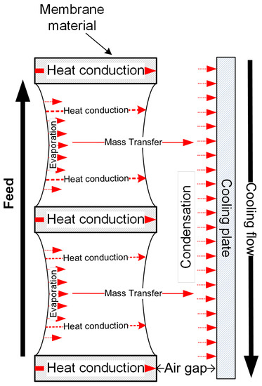 The schematic of heat and mass transfer is shown in Figure 4. Similar to DCMD, in the membrane pores, it is also an air-vapour mixture, and there is no total pressure difference across the pore. Therefore, the mass transfer through the membrane pore in AGMD is also a Knudsen-molecular diffusion transition mechanism. However, the vapour also has to pass through the air gap prior to the condensation on the membrane surface. The mass transfer in the air gap of AGMD can be calculated by [72]: