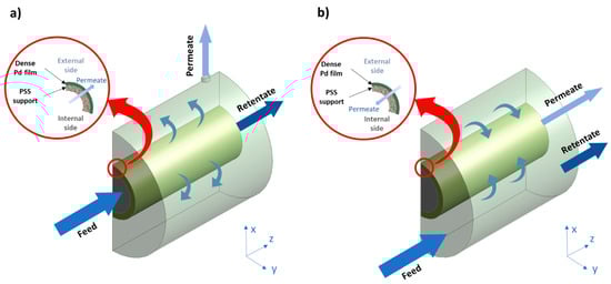 The membrane permeator cell was modeled using CFD by considering its real dimensions: internal diameter of 30 mm, 30 mm in length, and a total volume of 21,200 mm3. As the geometry presented a symmetry plane, only half of the device was considered in the model. The tubular composite membrane had inner and outer diameters of around 11 mm and 13 mm, respectively, dividing the model geometry into three different regions, as shown in Figure 1. Depending on the flow direction through the membrane module, two different configurations were modeled. In the in–out configuration (Figure 1a), the gas was fed into the reactor through the inner region of the tubular membrane, collecting the retentate stream from the opposite side along the z-direction and the permeate stream in the annular zone. Thus, the H2 first reached the porous media (modified PSS with intermediate layers) and then the fully dense Pd film. A contrary permeation scheme was considered for the out–in configuration (Figure 1b), where the feed stream was introduced in the cell through the outer region. Therefore, the fed H2 was in direct contact with the outer surface of the Pd film and the permeate had to go through this layer and then the porous media before reaching the lumen bulk gas phase.