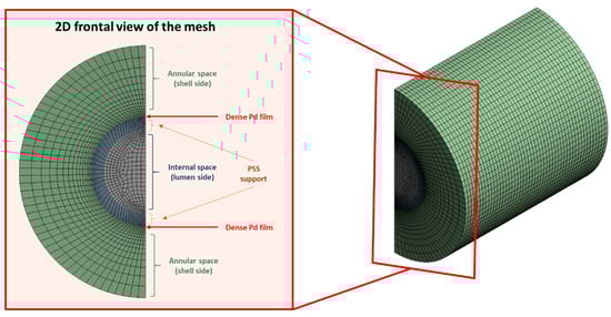 A conformal mesh was established for the geometry interfaces to reduce the computational cost. The mesh was carefully refined close to the PSS and dense palladium region. This mesh slightly varied for the two different configurations considered in the present study, with 74,935 and 78,694 elements for the in–out and out–in alternatives, respectively. This number of cells was high enough to give mesh-independent results. An example of the established mesh for the out–in configuration is presented in Figure 2, with this being analogous to the other configuration, namely, in–out.