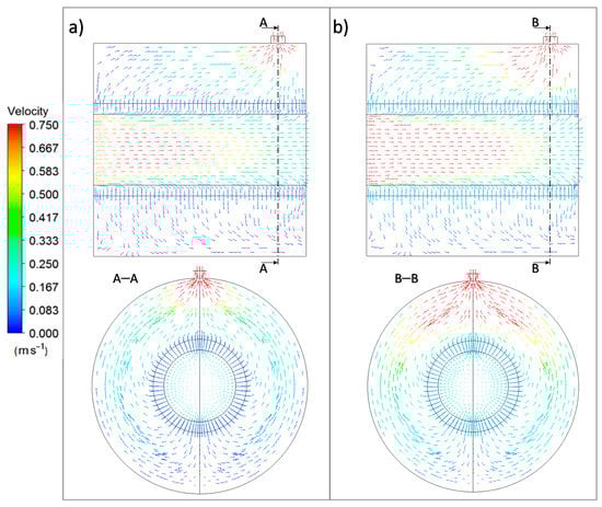 Velocity vectors for nitrogen permeation at 298 K through the PSS support (in–out configuration) at diverse pressure driving forces: (a) 0.5 bar and (b) 1.0 bar.