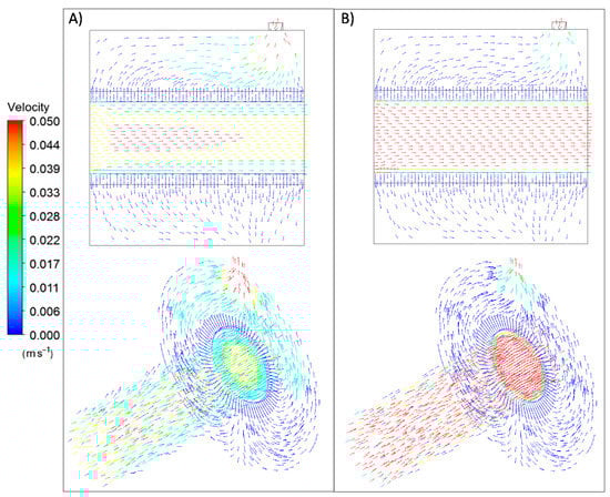Modeled velocity vectors during permeation at T = 375 °C, ΔP = 2 bar, in–out configuration, and different H2 molar fractions in the feed stream: (A) 0.9 and (B) 0.5.