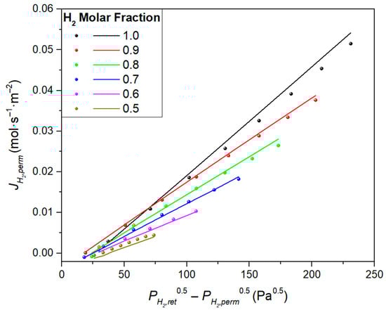 The H2 permeate flux simulation results were compared with the experimental ones for the out–in configuration in Figure 9. The simulations tended to underestimate the H2 permeate flux at low molar fraction feeds. A better agreement at high molar fractions was reached. These simulation series achieved excellent calculated permeances that were in agreement compared with the experiments, with deviations below 2%. Only the 0.5 molar fraction series had a worse agreement, with a permeance deviation of 13%.