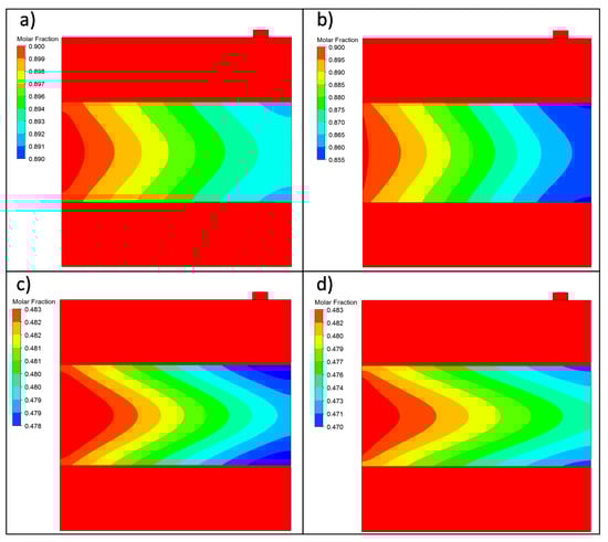 H2 molar fraction variation in the symmetry plane for the out–in permeation experiments at a constant temperature (T = 375 °C) but with various feeding conditions: (a) = 0.9 and ΔP = 0.5 bar, (b) = 0.9 and ΔP = 2 bar, (c) = 0.5 and ΔP = 1.4 bar, and (d) = 0.5 and ΔP = 2 bar.