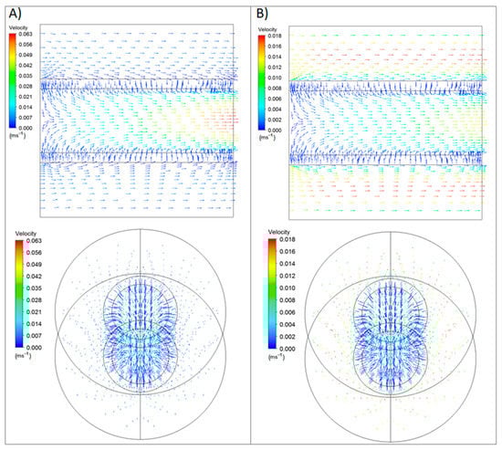 Velocity vectors for the out–in configuration at a constant temperature (T = 375 °C) and feed pressure (ΔP = 2 bar), but two different H2 molar fraction: (A) 0.9 and (B) 0.5.