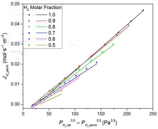 The H2 solution and diffusion through the bulk palladium is typically the controlling step when the Pd thickness is thicker than a few micrometers []. In these conditions, the total permeate H2 flux can be described using the well-known Sieverts’ law [], in which it is defined as a function of the membrane´s permeance (mol·s−1·m−2·Pa−0.5) and the difference between the permeate and retentate pressures to the exponent n = 0.5 acting as a driving force between both sides of the Pd film: