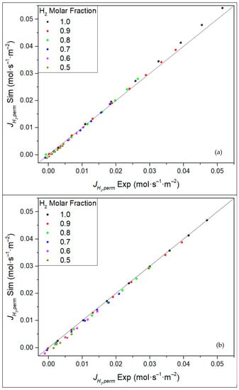 Parity plot for simulated permeation results against experimental ones for all the considered H2 feed molar fractions for different operating modes: (a) in–out and (b) out–in.