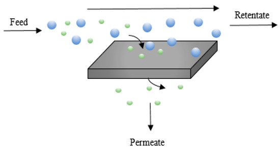 Besides PSA and cryogenic distillation, membrane separation has attracted the widest interest. A membrane is a selective barrier between two phases [107] that allows mass transfer under the action of a driving force [108] (e.g., gradients in pressure, temperature, concentration or electrical potential [107]). This allows for preferential permeation of some components of the feed stream, with retention of the other components [109]. See Figure 1.