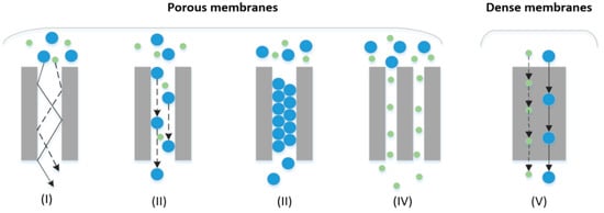 Transport mechanism for porous membranes ((I) Knudson diffusion, (II) surface diffusion, (III) capillary condensation, and (IV) molecular sieving) and dense membranes ((V) solution–diffusion).