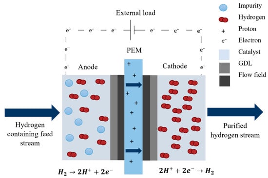 In principal, EHS is based on the following process (Figure 4). Molecular gaseous hydrogen (or a gas hydrogen-containing gas mixture) is injected at low pressure at the anode side of the proton exchange membrane (PEM) electrochemical cell. When the hydrogen makes contact with the anode electrode, hydrogen is oxidized into its constituents (protons and electrons), achieved with a Pt-based catalyst (Equation (26). The electrons then travel through an electrical circuit, whilst the protons move through the PEM to the cathode compartment. Finally, the protons and electron reduce to H2, at the cathode compartment (Equation (27). This can be carried out at high pressure to improve the specific volumetric energy density, for storage.