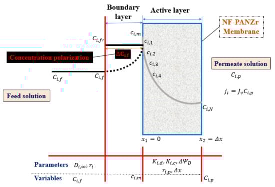 - Based on Equation (12), the knowledge of the value of , makes possible the integration of both Equations (5) and (9) after the determination of the initial concentration inside the NF-PANZr membrane .
