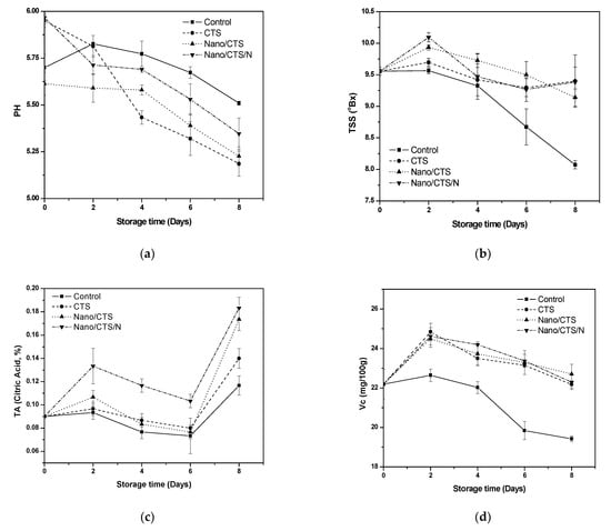 Effects of coating treatments on pH (a), total soluble solids (TSS) (b), total (TA) (c), and retention (Vc) (d) contents of cantaloupe fruit; data are mean ± SD, n = 3.