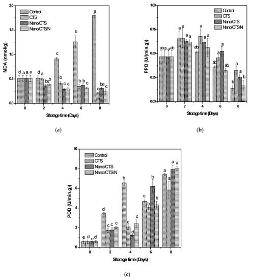 MDA is often used as a sign of fruit damage progress due to the structural integrity and cell membrane lipid peroxide levels [33]. As shown in (Figure 3a), a constant increase was detected for the control samples, while the treatment of nano-material delayed MDA increases. CTS treatment had 0.22 nmol/g, which was lower than the other samples by the end of the storage period. It suggested that all nano-treatments can inhibit the peroxidation of lipids during storage.