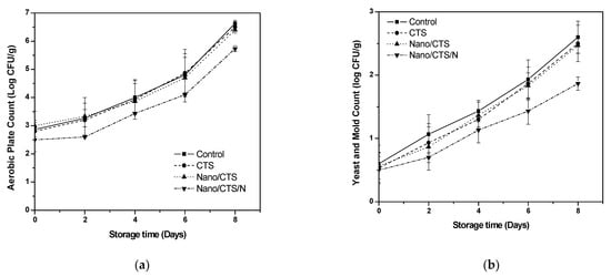 The development of microorganisms is shown in (Figure 4a). The internal aerobic microorganism counts were significantly higher in the control sample as (2.87 log CFU/g) and Nano/CTS (3.00 log CFU/g) compared with CTS (2.80 log CFU/g) and Nano/CTS/N (2.50 log CFU/g), respectively. A gradual increase was detected in the microbial growth for all the treatments during the storage. However, by the end of the storage, the control recorded (6.63 log CFU/g), followed by Nano/CTS and CTS treatments, whose microbial level had a little similarity (p ≥ 0.05) (ranging from 6.50 to 6.40 log CFU/g). Finally, the cantaloupes treated with Nano/CTS/N presented the lowest microbial counts (5.73 log CFU/g) at the end of the storage time [37].
