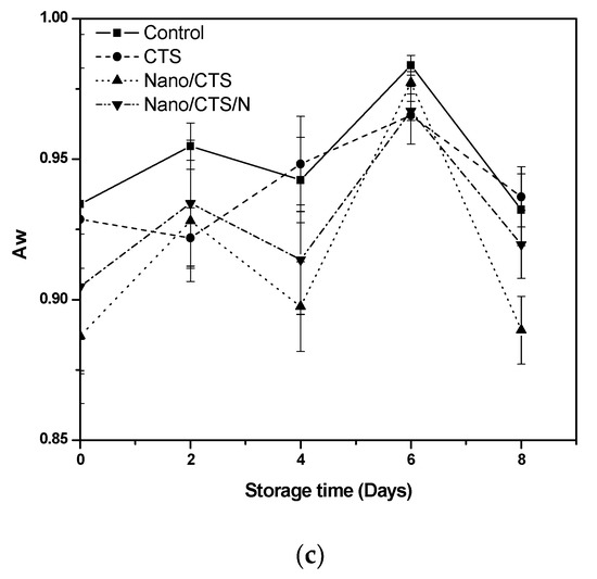 The presence of mold and yeasts is presented in (Figure 4b). Nano/CTS/N treatment reduced the growth to (1.87 log CFU/g), followed by Nano/CTS, whose microbial level was (2.47 log CFU/g) on the 8th day of storage, respectively. Finally, the control recorded the highest counts as (2.60 log CFU/g). CTS treatment could decrease the microbial growth of yeasts and molds, which was in agreement with Syahidah et al. [38]. Chong et al. (2015) [22] suggested that the positive protonated (NH3+) in the (C-2) of the polysaccharide can react with phosphoryl groups in the cell membrane. Similar reports have been approved [12,39]. Aw is responsible for the cell wall water holding capacity of cantaloupe tissue. The (Aw) of untreated cantaloupes ~0.93 was different compared to all the treated ones with nano-material treatments (0.88–0.91) as shown in (Figure 4c).