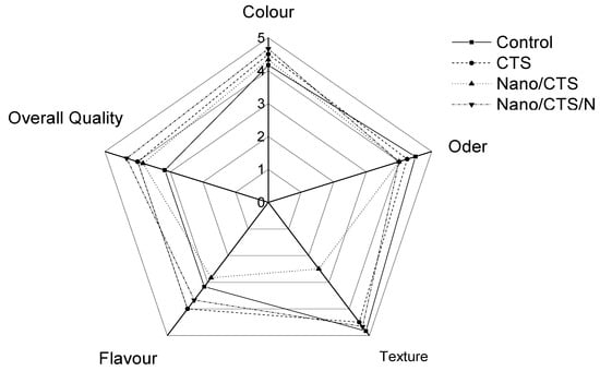 The sensorial properties made by different coating treatments such as color, odor, flavor, texture, and overall quality are shown in (Figure 5). Control and Nano/CTS sample treatments showed the least acceptance score in a comparison with the other sample treatments; while Nano/CTS/N treatment sample gave the highest score. It may be as a result of higher microbial activities [37]. According to the results, it can be established that using the Nano/CTS/N condition was the most acceptable to be used in cantaloupe preservation.
