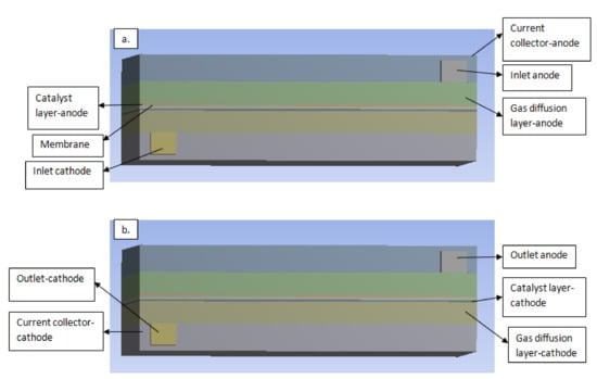 A three-dimensional view of the single PEM fuel cell and its components. (a) Inlet channel (b) outlet channel.