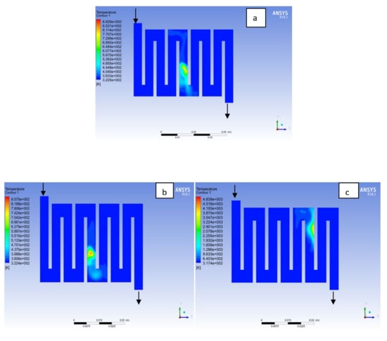 The contours for temperature distribution in the channels for aluminium, copper and steel materials are shown in Figure 4, Figure 5, Figure 6, Figure 7, Figure 8 and Figure 9, respectively, for both anode and cathode side at temperatures of 298, 323, and 338 K at 0.7 V. The temperature distribution increases with increase in temperature. It can be observed at the interface between the catalyst layer and membrane in the anode region of each material that the temperature distribution is slightly different across each flow field channels and having temperature variations between 1 and 6 K. However, it was noticed that the highest temperature is at the cathode side for various materials temperature distribution in the channel due to electrochemical reaction and ohmic heating taking place. It is observed for Al material that the temperature at 338 K rises to 994 K, which is the highest temperature distribution variation, while at temperature 298 K steel materials has the lowest temperature distribution variation of 221 K among all other materials. The 3D numerical simulation temperature contours result shows that reactant adsorption on material surfaces has a significant effect on cell performance.
