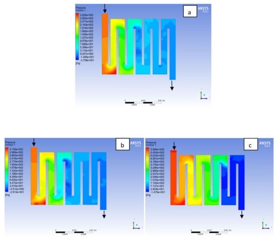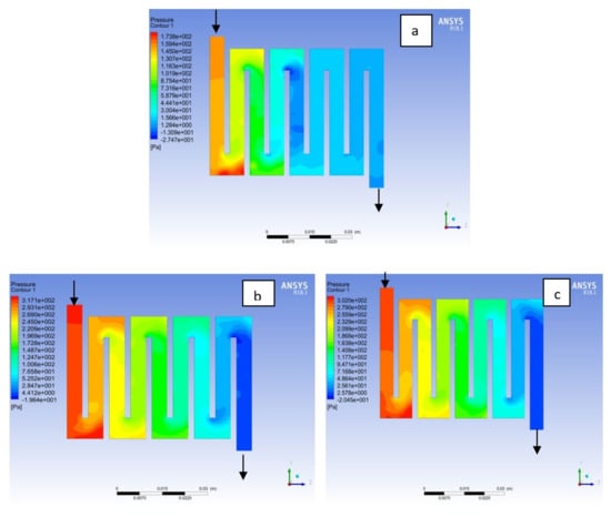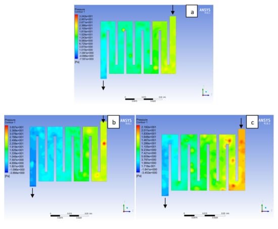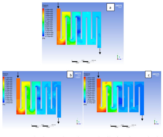 Pressure distribution at the anode region (GDL/CL) for each material with temperature 323 K at 2.5 bar: (a) Aluminum, (b) Copper, (c) Steel.