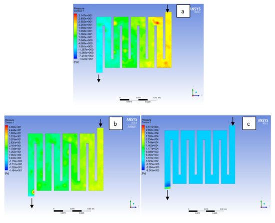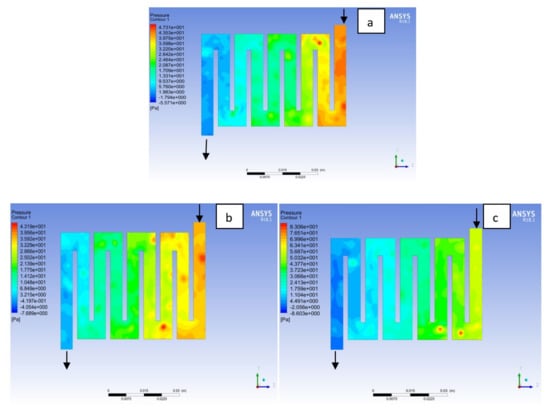 Pressure distribution at the cathode region (GDL/CL) for each material with temperature 323 K at 2.5 bar: (a) Aluminum, (b) Copper, (c) Steel.