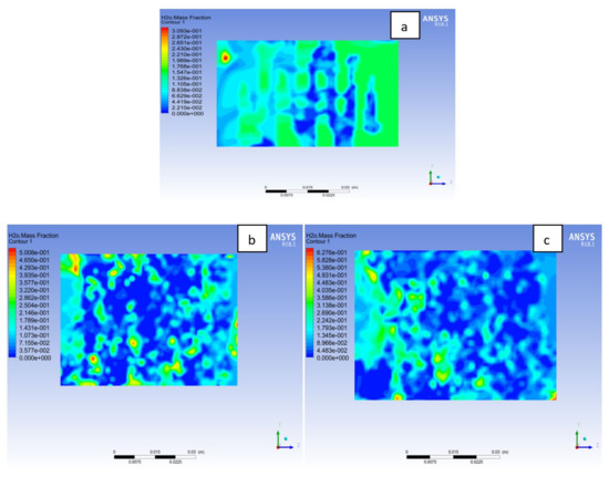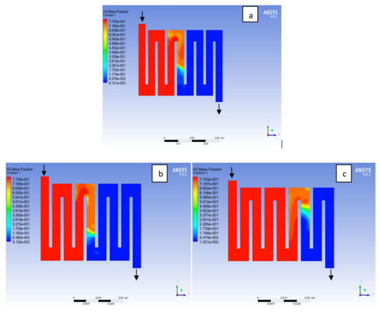 Contours of hydrogen mass fraction at the anode region (GDL/CL) for each material with temperature 323 K at pressure 1.5 bar: (a) Aluminum, (b) Copper, (c) Steel.