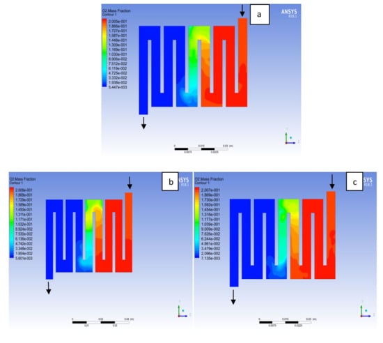 Contours of oxygen mass fraction at the cathode region (GDL/CL) for each material with temperature 323 K at pressure 1.5 bar: (a) Aluminum, (b) Copper, (c) Steel.