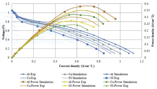 Figure 19 illustrates serpentine bipolar plate materials of the polarisation curves (left y-axis) and power density (right y-axis) for both numerical and experimental results for the single fuel cell under the same operating conditions. It is observed that the materials followed a similar behaviour and the effect of each material at low current density can be negligible but at a higher current density, the effect of the material on cell performance is significant. Additionally, it is noticed that the simulation results performed better than the experimental results. The Al material performed better than Cu and SS throughout the operating condition which reflected both in the numerical and experimental results, which can be attributed to low mass transport losses. Yu et al. [42] investigated an experiment on adsorption of Al, Cu, Mg, and Ti surfaces. Their results show that hydrogen adsorption on Al surfaces is more stable than other metals. A similar experiment was conducted by Meng and Alfred [43]; they concluded that hydrogen atoms bond weakly to Cu surfaces. Since SS is an alloy metal; this contributes to the reason why it has the lowest fuel cell performances. In addition, SS surface interactions with hydrogen atoms will result in high instability. The peak powers percentage difference for various materials between simulation and experimental results are illustrated in Table 4.