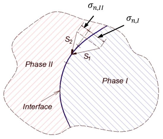 In the context of this work, we adopt the assumption of no jump in the shear stress on the interface. Our motive in this stems from the sharp interface limit in which the interface represents a surface of discontinuity deprived from any physical properties [26,27]. Such an assumption, together with the sharp interface limit argument, implies the following two points—namely, (1) no jump in the velocity at the interface, (2) no jump in the shear stress along the interface as long as there is no gradient in the interfacial tension. The continuity of the normal component of velocity complies with the mass conservation law, while the continuity of the tangential components of velocity complies with the regular no-slip condition. In a future work, we shall consider the cases when these conditions are not satisfied. The jump in normal stress exists in both scenarios and is responsible for the curvature of the interface between two immiscible fluids; see Figure 1. The treatment of the motion of a multiphase system can be quite complex. In general, the obvious, but not necessarily the easiest method is to consider a different set of equations for each fluid phase. In the context of the general flow field (i.e., the overall domain), this requires the coupling of the different fluid domains together through conditions at the interface, which would essentially require the continuous monitoring and tracking of the interfaces. This can be computationally expensive, particularly if there exist several such interfaces. Other techniques exist that are customized to different situations in order to reduce the computational burden, which will be briefly discussed in the next section.