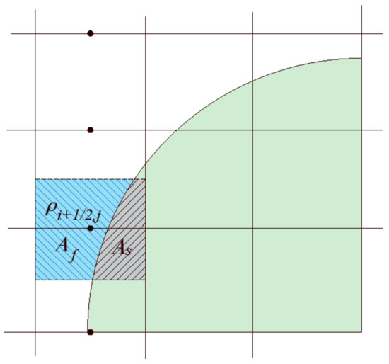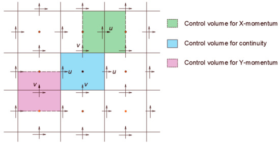 As introduced earlier, the modeling methodology of this problem rests on the one-domain model, in which both the fluid and the solid disk are assumed to be fluids. This roll out the need to consider the boundary condition at the solid–fluid interface and means that the computational grid must include the solid disk. The velocity of the solid domain is, apparently, constrained by the required rigid body motion. The governing equations describing this system, including the continuity and the momentum balance equations (Equations (3) and (6)), are discretized over a staggered grid as shown in Figure 4 [44,45,46,47,48,49]. Several schemes are available for the numerical solution of the N-S equations; see, for example, Gylys et al. [50] and Horwitz and Mani [51]. To numerically solve this system subject to certain boundary conditions, a semi-implicit scheme is developed, such that: