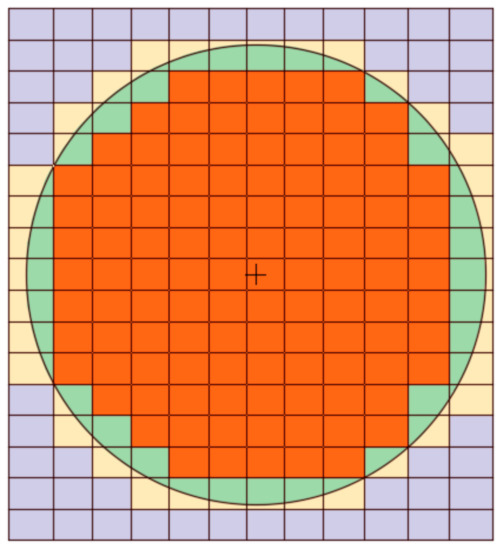 In our case, three fields are designed for the three unknowns—namely, the pressure and the velocities in both x and y directions. These fields have particular character in that they are 1 in the cell of interest (or on the face) and zeros in all other cells (or faces). Therefore, for our 2D case with n × m cells there are (nm) fields for the pressure, (n + 1) × m for the u velocity component, and n × (m + 1) for the velocity component v. More details about this technique can be found in the works of Salama et al. [52]. The velocity of the centroid of the disk is considered the average of the velocity of all the cells contained inside its circular boundary; see Figure 5. They are calculated as: