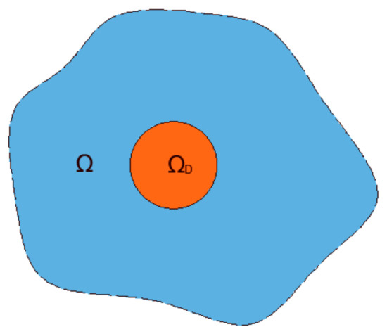 The problem will even be more complicated should the object be another fluid immiscible with the surrounding fluid. The governing equations that are applicable to all phases represent conservation laws of mass and momentum [26,27,28,29,30,31,32]. As mentioned, these equations can apply to all fluid regions augmented with equations at the interface between phases. Such an approach may be known as a multidomain approach, in which each domain is described by different fluid properties that are generally homogeneous (in cases where no heat or species transport occur). Therefore, is the computational domain, which contains a two-phase system. We are particularly interested in the case in which one of the phases is completely enclosed inside the other phase. For the time-dependent problem (within the time period [0, T]), the two domains are defined as and , with and . In this case, the interface is defined as . Over the domain , the governing equations summarizing the conservation laws can be written as: