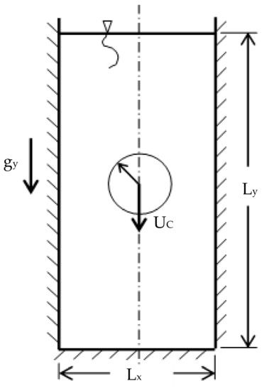 Now, we benchmark the results of this work and compare them with the analytical solution and other simulation results. We show the effects of the different methods to handle the cell face- and cell center-related coefficients on the terminal velocity. The domain of interest is shown in Figure 9 below, which defines a two-dimensional rectangular domain of height Ly and width length Lx. In the middle of this domain, an extended cylinder of radius a is initially inserted and is released to settle under the effect of gravity. The object will initially accelerate until reaching a terminal velocity, which will be maintained for the rest of the motion until the disc encounters the bottom boundary. The contours of some hydrodynamic parameters, such as the vorticity as well as the y-direction velocity profiles at different sections, will be generated.