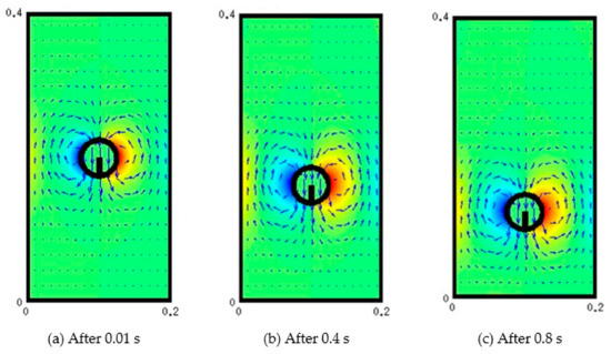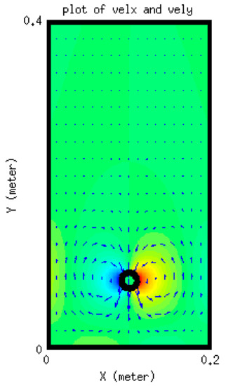 Vorticity contours are shown in Figure 11c, from which it is clear that the area in the vicinity of the settling object encounters the largest circulation. The velocity vectors of the fluid are also shown Figure 12. It can be seen that the velocity vectors are relatively large in the vicinity of the particle compared with that far from the particle. The profile of the components of the position of the particle with time is depicted in Figure 13. This shows the location of the centroid of the solid particle when the diameter is reduced to 0.02 m after 0.4 s. It is clear that the particle stays at the center line (constant x-coordinate) while the y-coordinate decreases with time. Figure 14, on the other hand, shows the y-component velocity magnitude, from which it is clear that the velocity reaches a terminal value as the time proceeds.