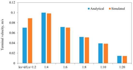 Comparisons between the terminal settling velocity and the simulated one for different diameter to width ratios. In these simulations, the following parameters are held fixed: μf = 0.001 Pa·s, μp = 1000 Pa·s, Mesh nx = 40, ny = 80.