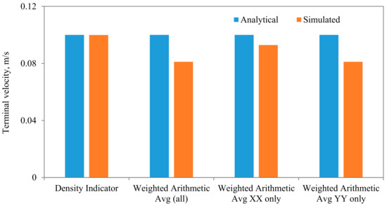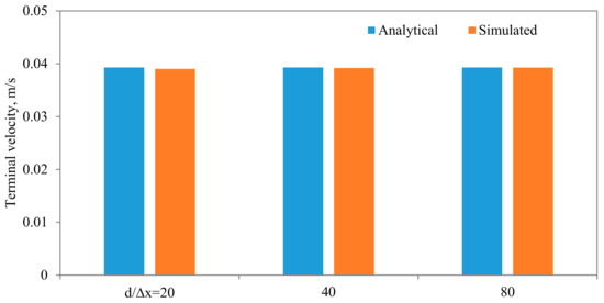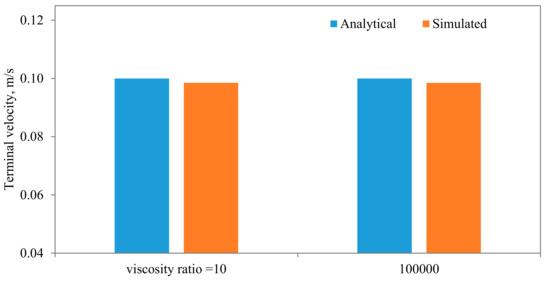 Comparisons between the terminal velocities calculated using Equations (22) and (23) and that simulated assuming different diameter to width ratios, for the same parameters and mesh resolution, are shown in Figure 15. As can be seen, very good agreements can be observed, except when the diameter of the particle is closer to the width of the channel. The influences of the algorithm for calculating the density of the fluid in the cell that encompass the interface are shown in Figure 16, from which it is evident that the density calculated using the density indicator is more accurate. This should come as no surprise, as the volume of the cell occupied by one fluid versus the other volume is utilized in the calculation of the density. Figure 17 shows the effect of the viscosity ratio between the two fluids. It is clear that the viscosity contrast does not seem to have a significant effect for the range considered in this work. This is also in conformity of the finding of Salama [16,17,18] upon the study of the critical velocity of dislodgment of the breakup scenario of a permeating velocity. The effects of the spatial resolution of the mesh are depicted in Figure 18, from which it is clear that the developed algorithm is accurate even with a relatively coarse mesh. This is a great advantage, as regular sharp interface models require exhaustively denser meshes to track and reconstruct the interface [10,11,12,13,14]. Furthermore, they confront difficulties when there are large contrasts in properties (e.g., large viscosity contrast between the two fluids). In this approach, such difficulties do not exist and the model can span a large spectrum of contrasts from the solid particle limit to droplets.