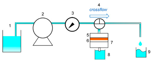 Cross flow apparatus of elastic membrane. 1: Feed solution, 2: pump, 3: pressure gauge, 4: three-way cock, 5: filter holder, 6: elastic membrane, 7: O ring, 8: elution, 9: recovery solution by cross flow.
